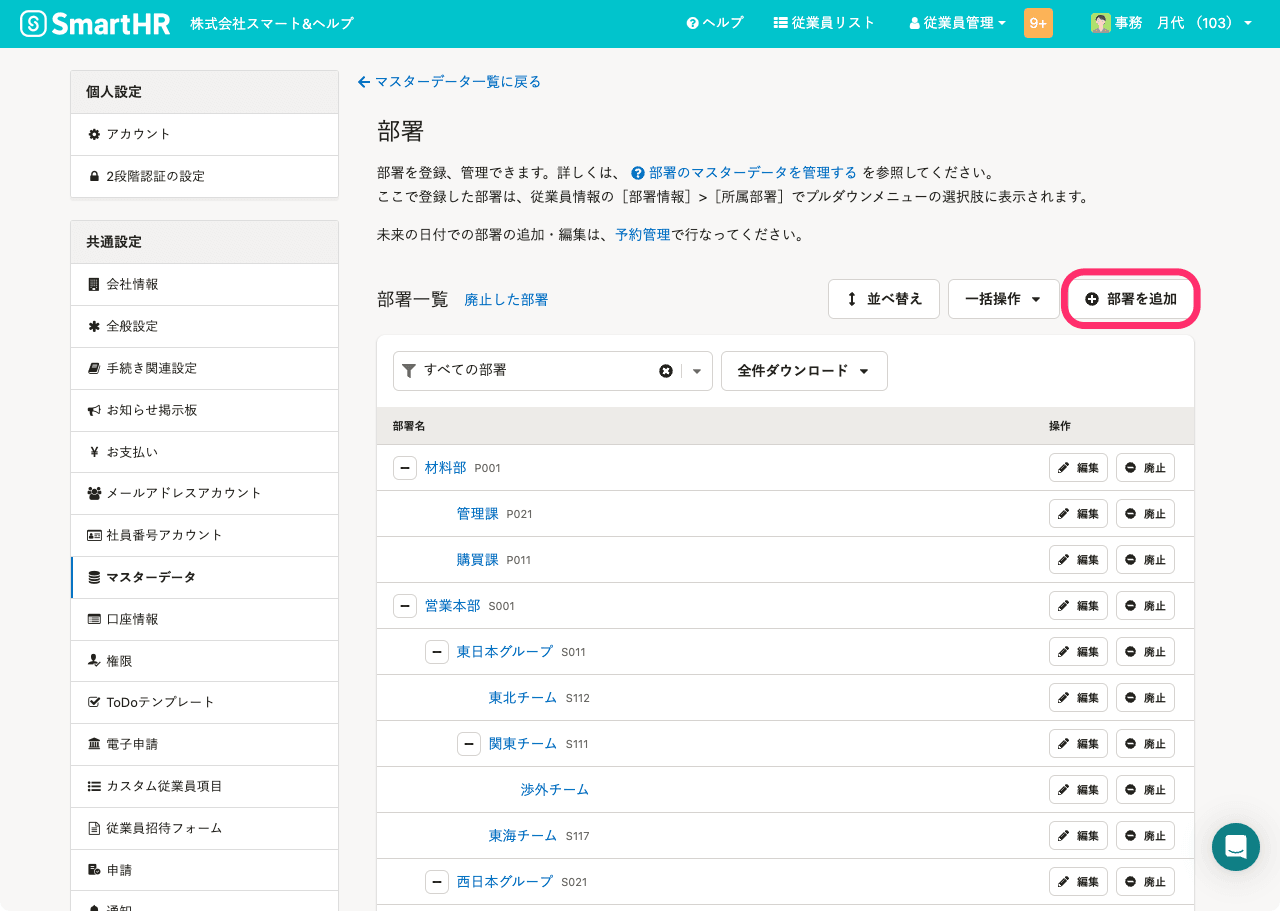 SmartHRの画面のスクリーンショットで操作の位置を示す場合は下記のように書きます。 画像内で囲みをつけている箇所は本文中に記載しているため、代替テキストには含めません。