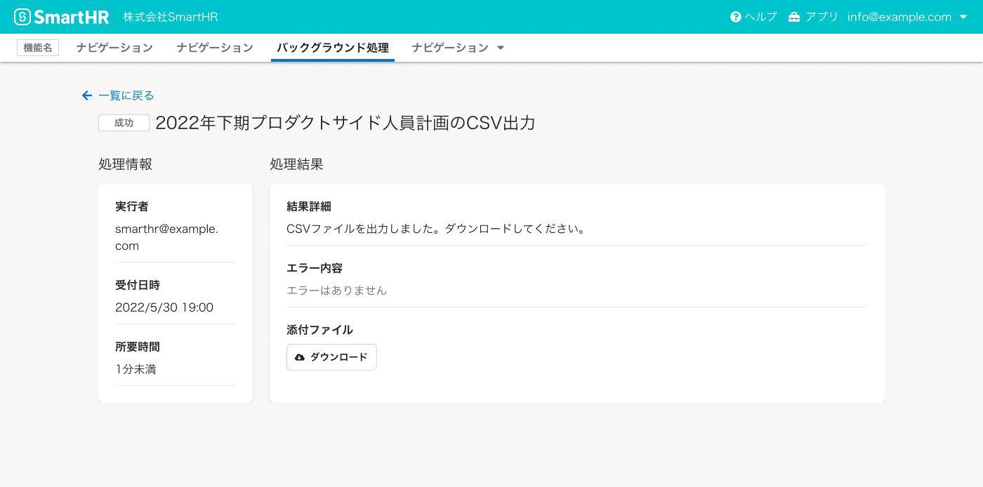 バックグラウンド処理をリクエストしたときに表示する文言は、{処理名}を受け付けましたとし、バックグラウンド処理結果の一覧画面へのリンクをフィードバックとして表示します。