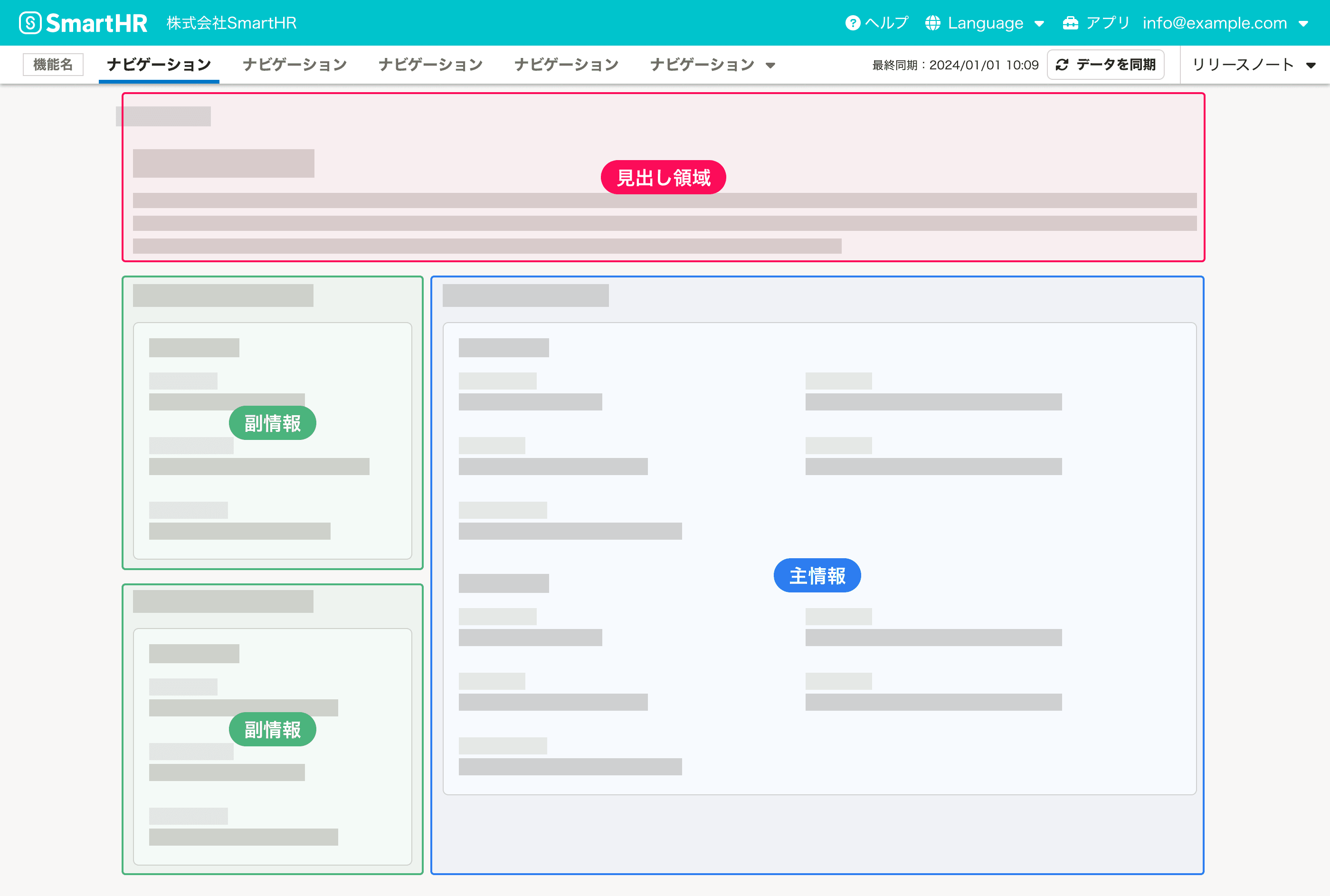 イメージ画像:ヘッダー・見出し領域が垂直方向に積み重なっている。その下に、左側に副情報、右側に主情報が並んでいる。