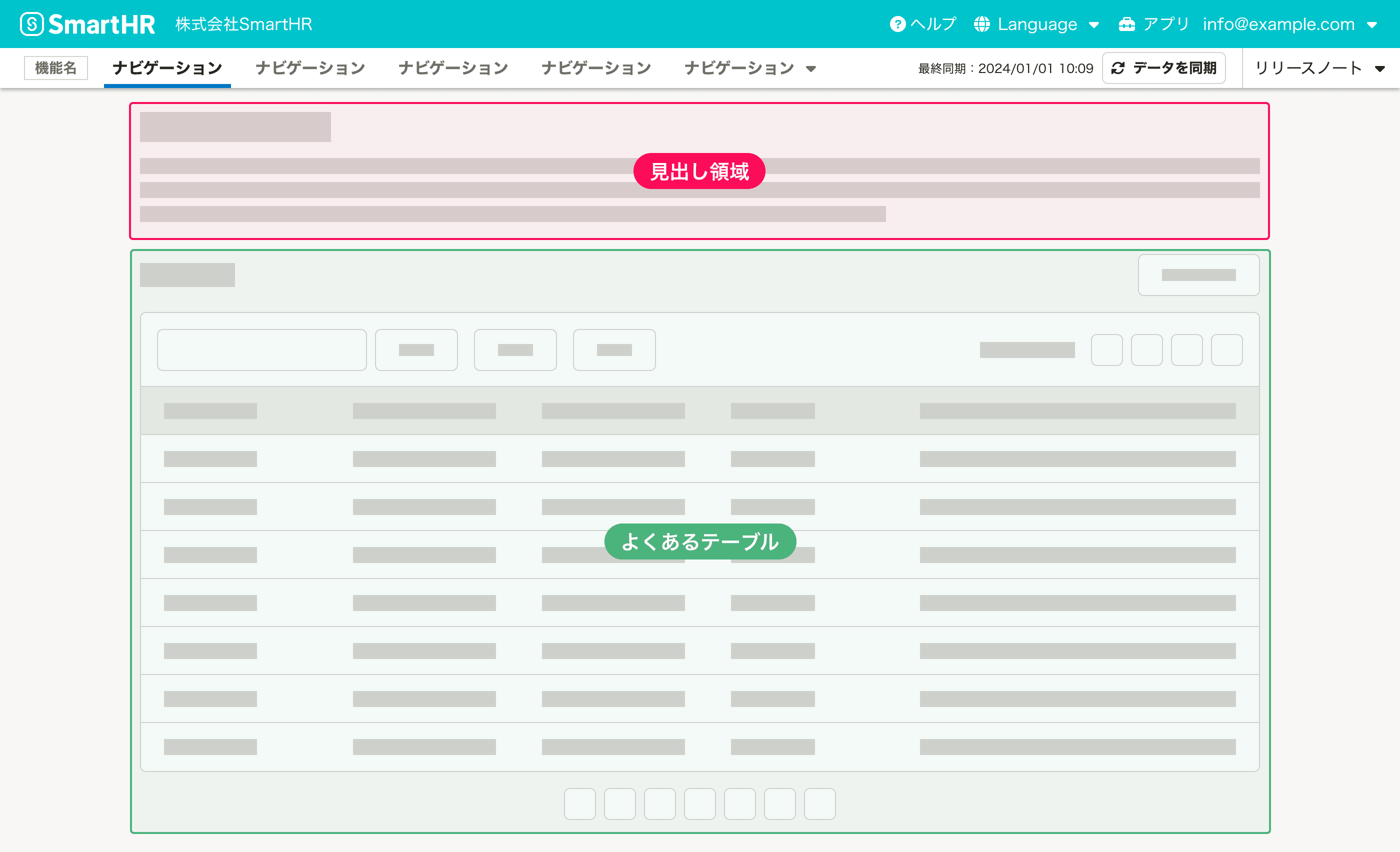 イメージ画像:ヘッダー・見出し領域・よくあるテーブルが垂直方向に積み重なっている