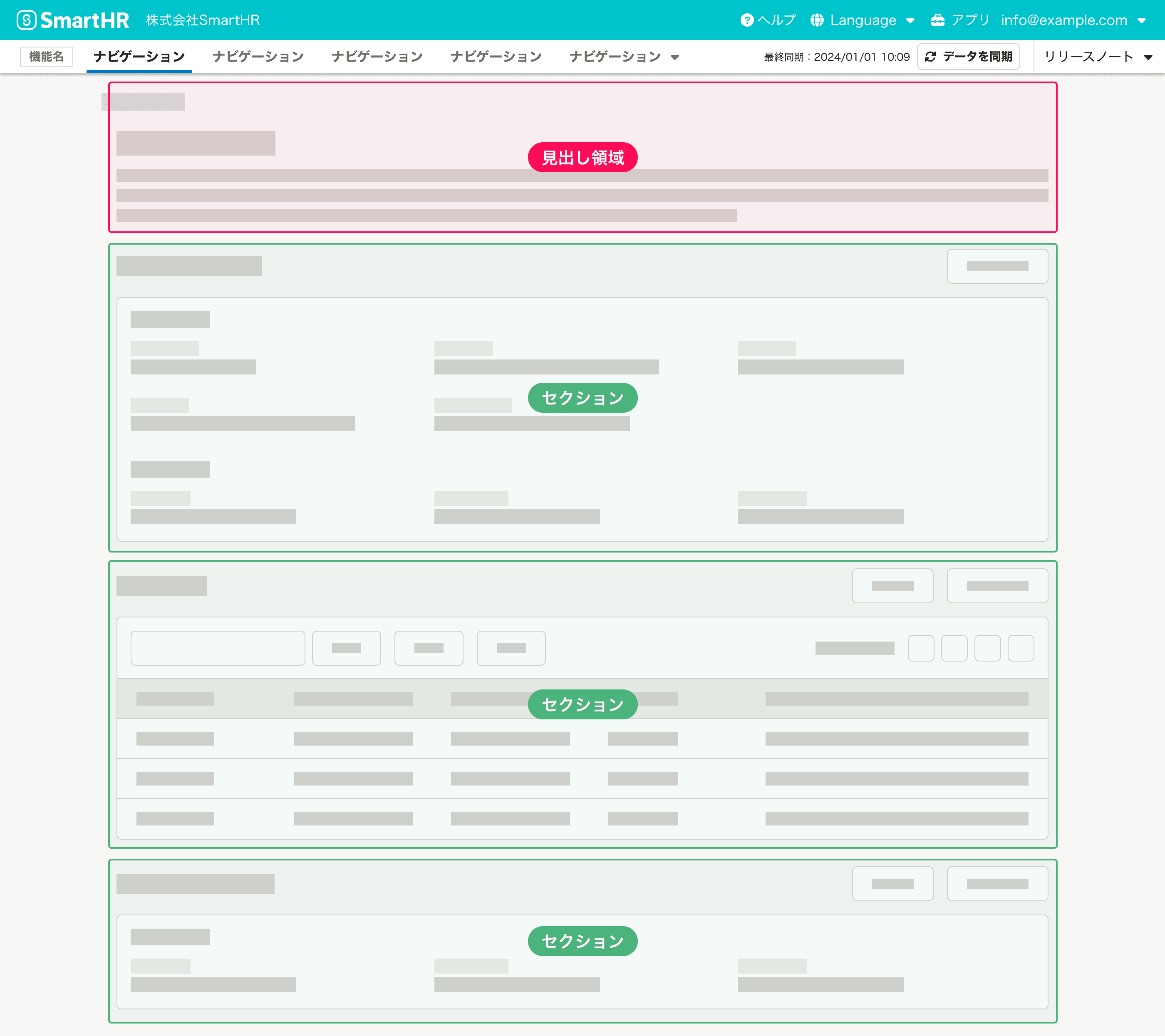 見出し領域と複数のセクションで構成されます。