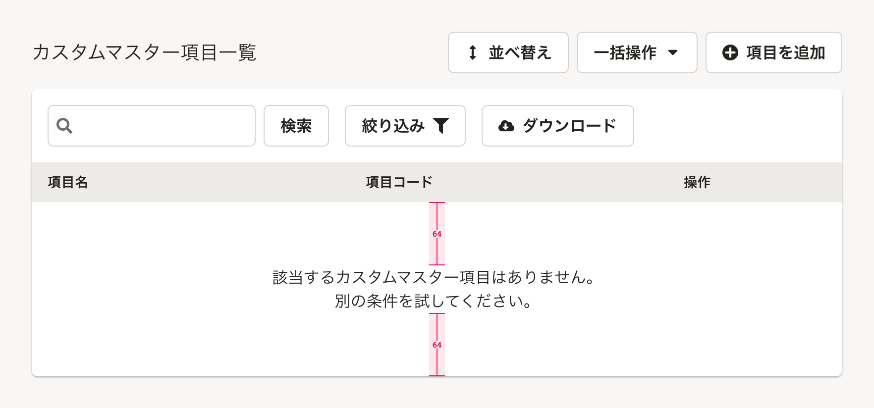 オブジェクトの検索結果や絞り込み結果が0件であった場合の表示パターンです。 検索結果のオブジェクト数は0件ですが、オブジェクト自体はテーブルに存在しています。
