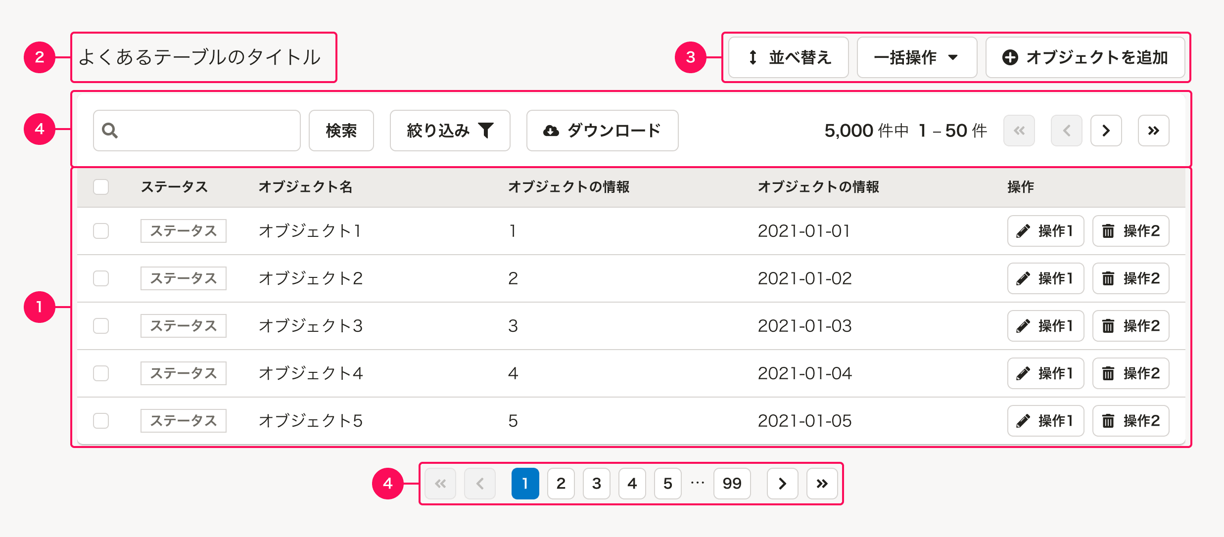 テーブルのページ数、ページ番号9,999 件中 1-5 件多くの場合、「{総件数} 件中 {表示している順番の範囲} 件」のように、現在表示しているテーブル内容の現在位置を示します。